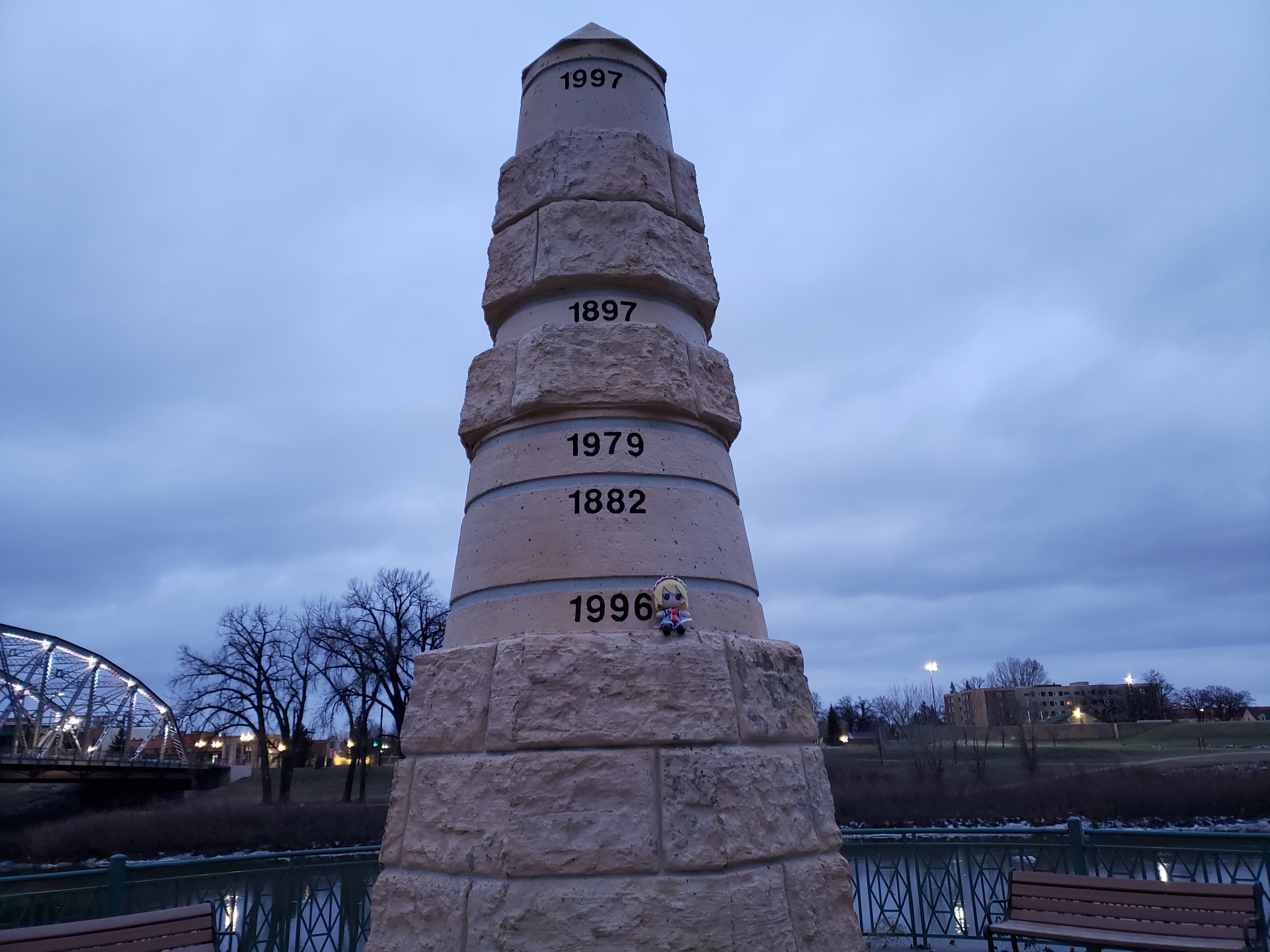 Alice on the flood marker for the Red River!