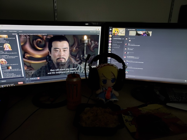 To finish up the night, alice is watching 3 kingdoms with the fumo chat, including her owner manny! While enjoying ramen noodles with rice egg and monster